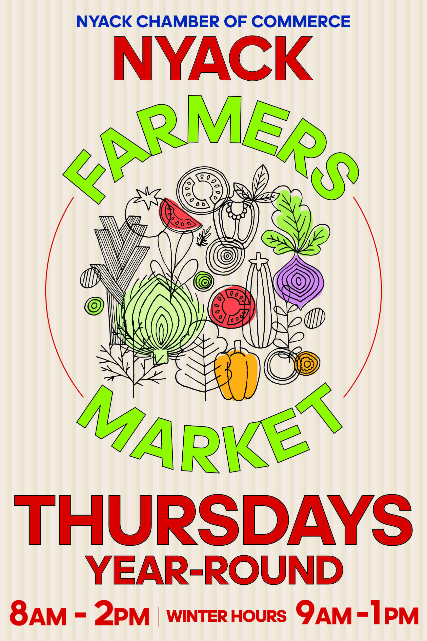 The Nyack Farmers Market operates every Thursday, From 8am to 2pm, from April to November from 9am - 1pm from December to March in the Main Street parking lot, rain or shine. See you Thursday. Subscribe to the Farmers Market newsletter.