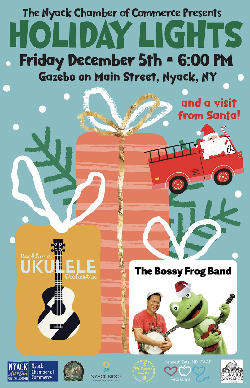 Join us to celebrate the season of family, friends and giving on Friday, December 5, 2025 at 6:00pm. Performances by the Rockland Ukulele Orchestra and the Bossy Frog Band, Thanks to our sponsors Nyack Ridge Rehabilitation and Nursing Center, Breakfast & Burger Club, Pickwick Bookshop, Village of Nyack and Kenneth Zatz Pediatrics.