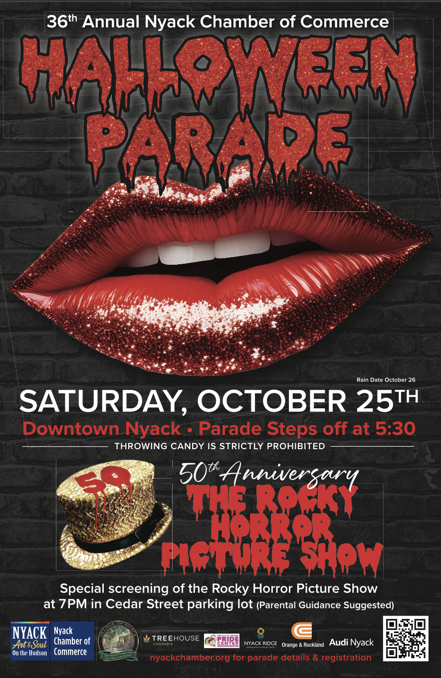 Nyack Chamber of Commerce presents the 36th Annual Nyack Halloween Parade celebrating the 50th Anniversary of the Rocky Horror Picture Show on Saturday, October 25 (Rain date: Oct 26) This year’s parade will include a screening of the Rocky Horror Picture Show at 7pm at the corner of Cedar and Main Street and a flash mob style dance troupe performing Time Warp along the parade route. If anyone is interested in doing the Time Warp... again.., or for the first time..should email her at danaditrani@yahoo.com