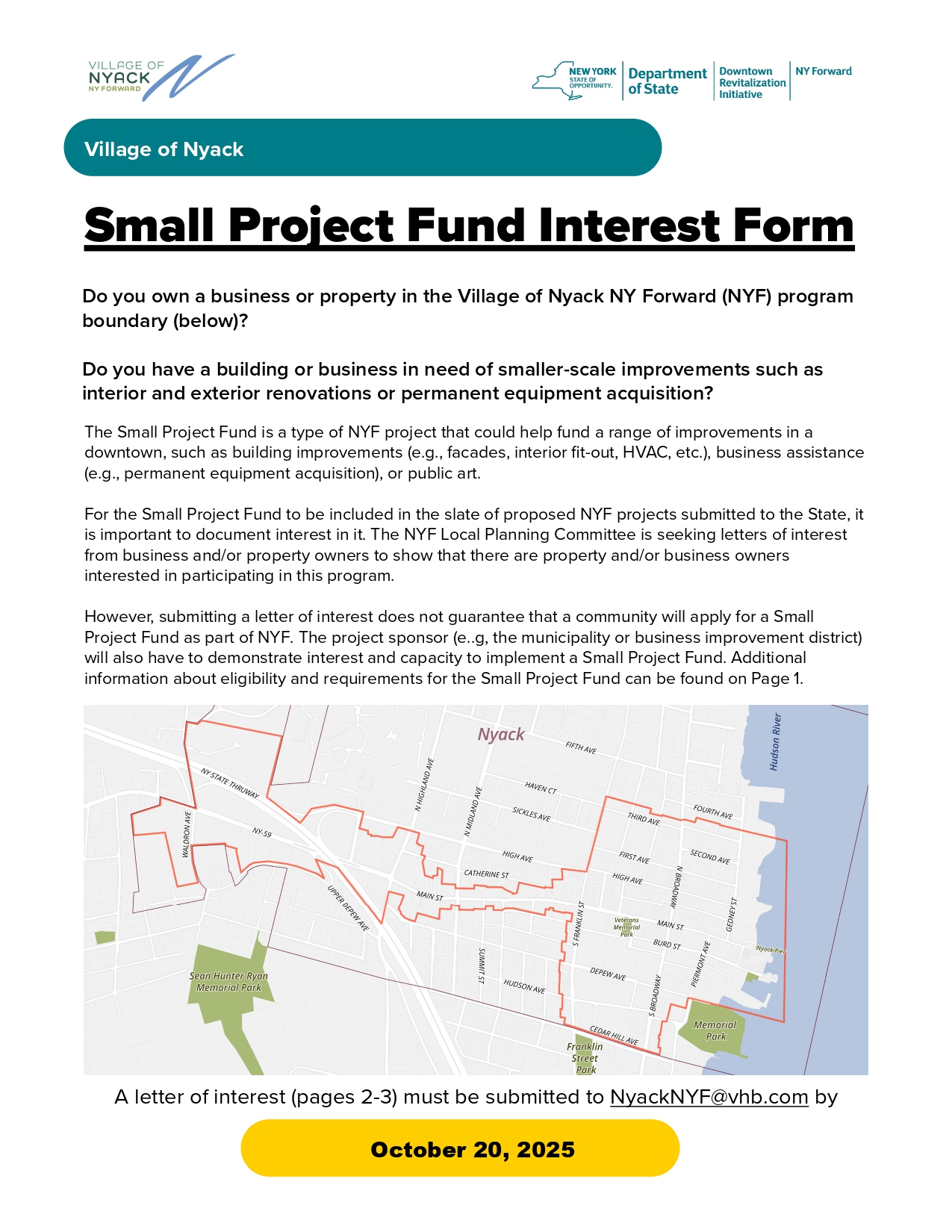 Please review and consider applying for support for your small business from NY Forward's Small Project Fund by completing an Interest Form and submitting it to Ann Marie Tlsty at Village Hall by October 20, 2025.